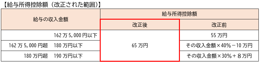 具体的には、給与収入が年間190万円以下の場合、給与所得控除が65万円へ引き上げられました。