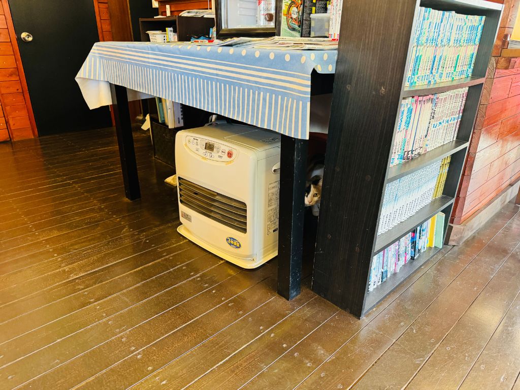 すごくきれいな毛並みの猫が、ストーブの影からこちらを覗いていました。