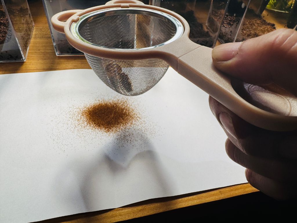 ふるい(茶こし)にかけて、胞子を包んでいた胞子嚢やゴミを取り除きます。