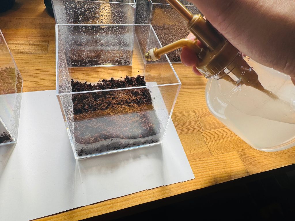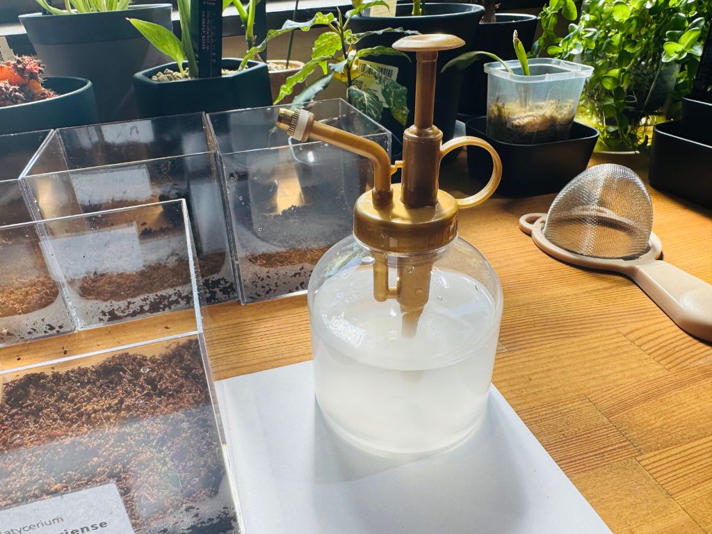 胞子を蒔いたら、ベンレート液を吹きかけます。