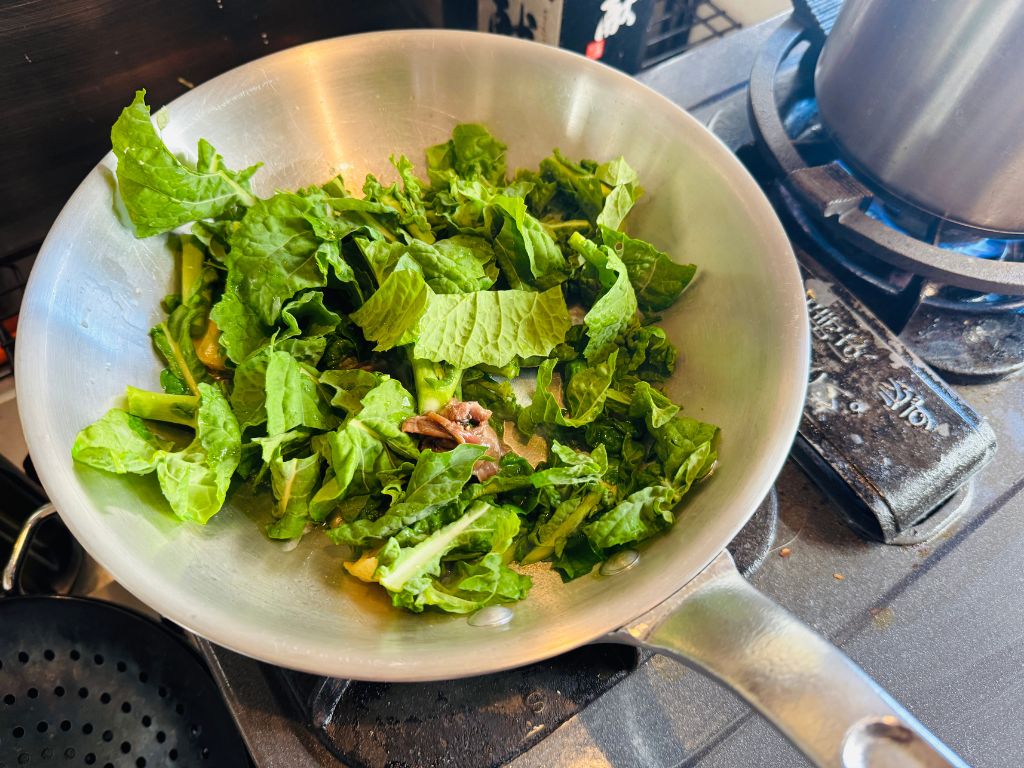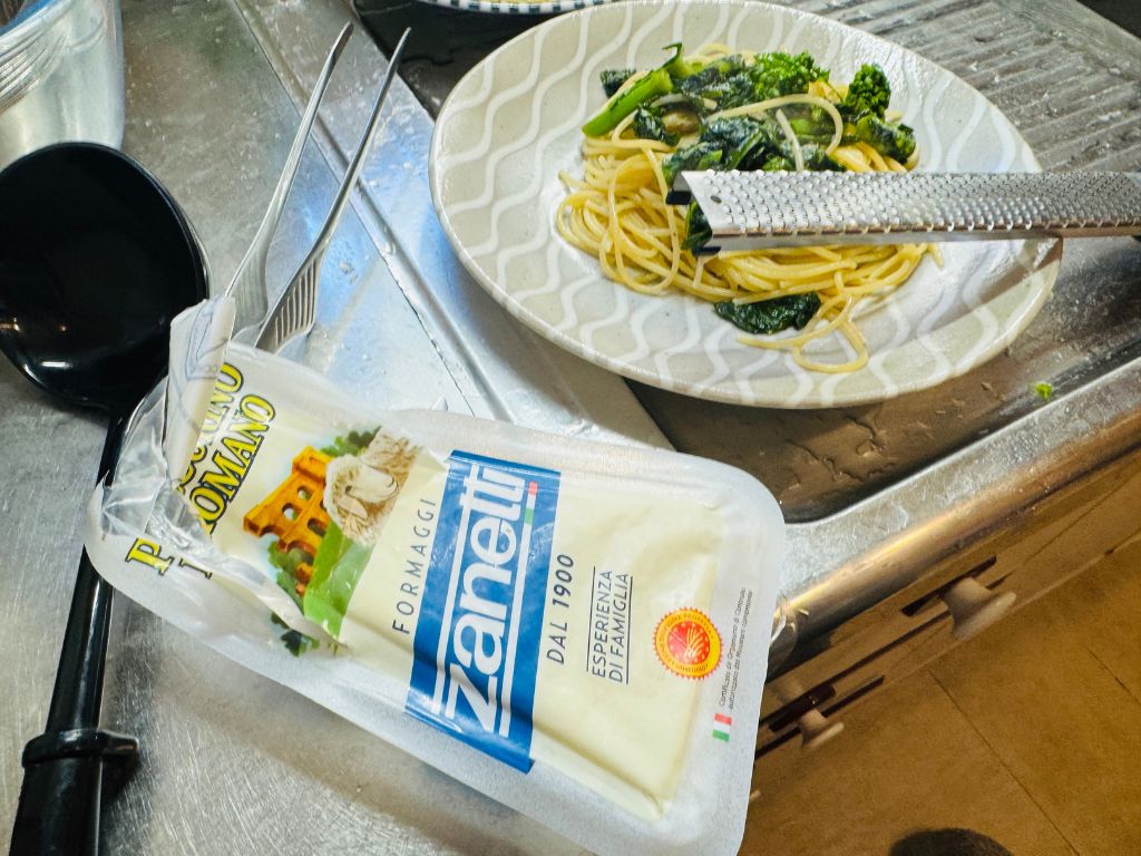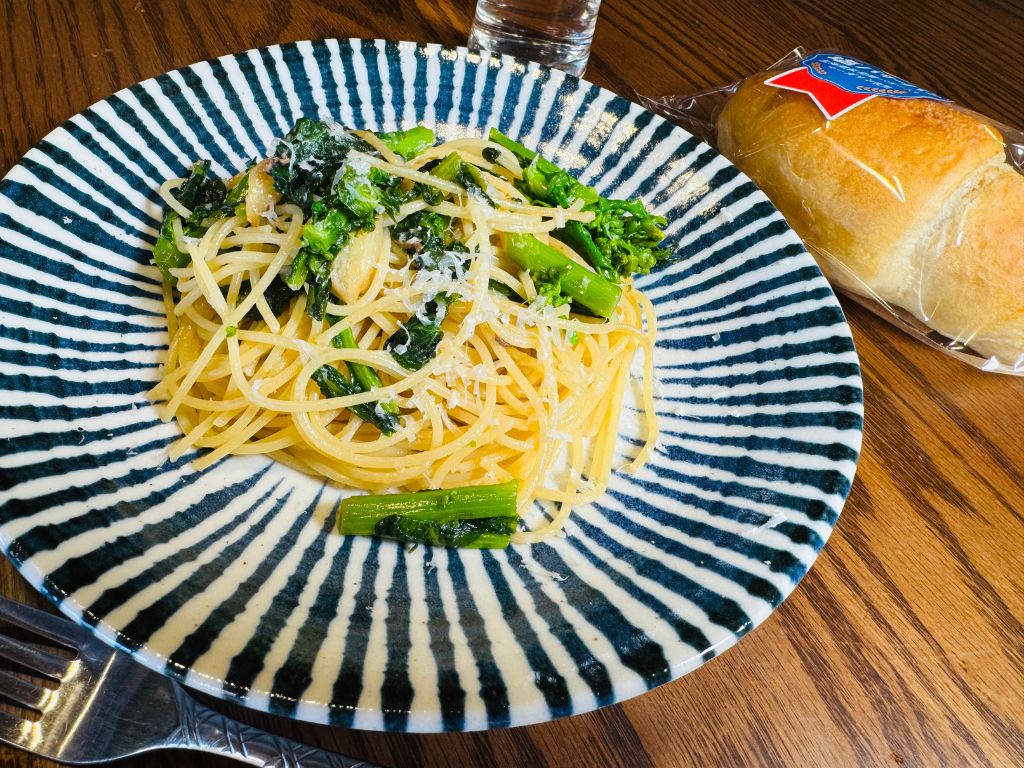 お昼のメニューはナバナとアンチョビを使った『ペペロンチーノパスタ』