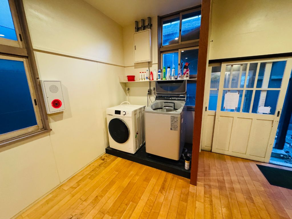 個室シャワー、洗面台、洗濯機があります。