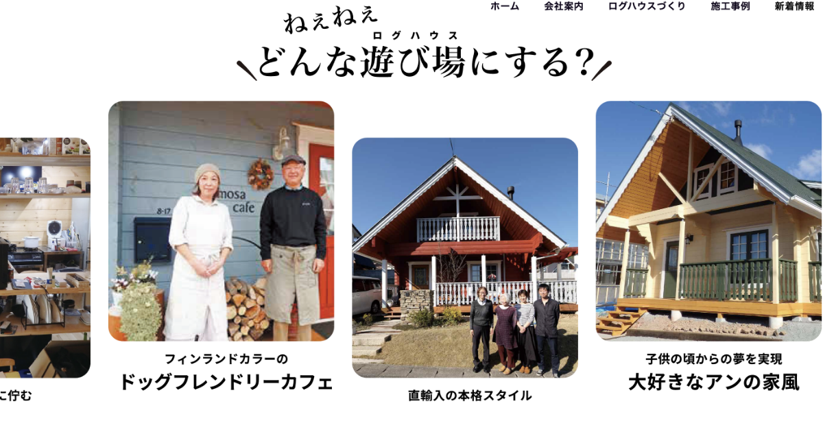 直輸入材による高品質なログハウスを自由設計で提案し、セルフビルドから施工まで柔軟に対応。